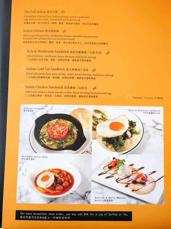 早餐是一天活力的來源,這一大碟全餐就已包括7款配料,集齊Parma Ham、意大利肉丸、蘑菇、番茄、火箭菜、自家製麵包,份量澎湃,讓人感受到無限滿足。